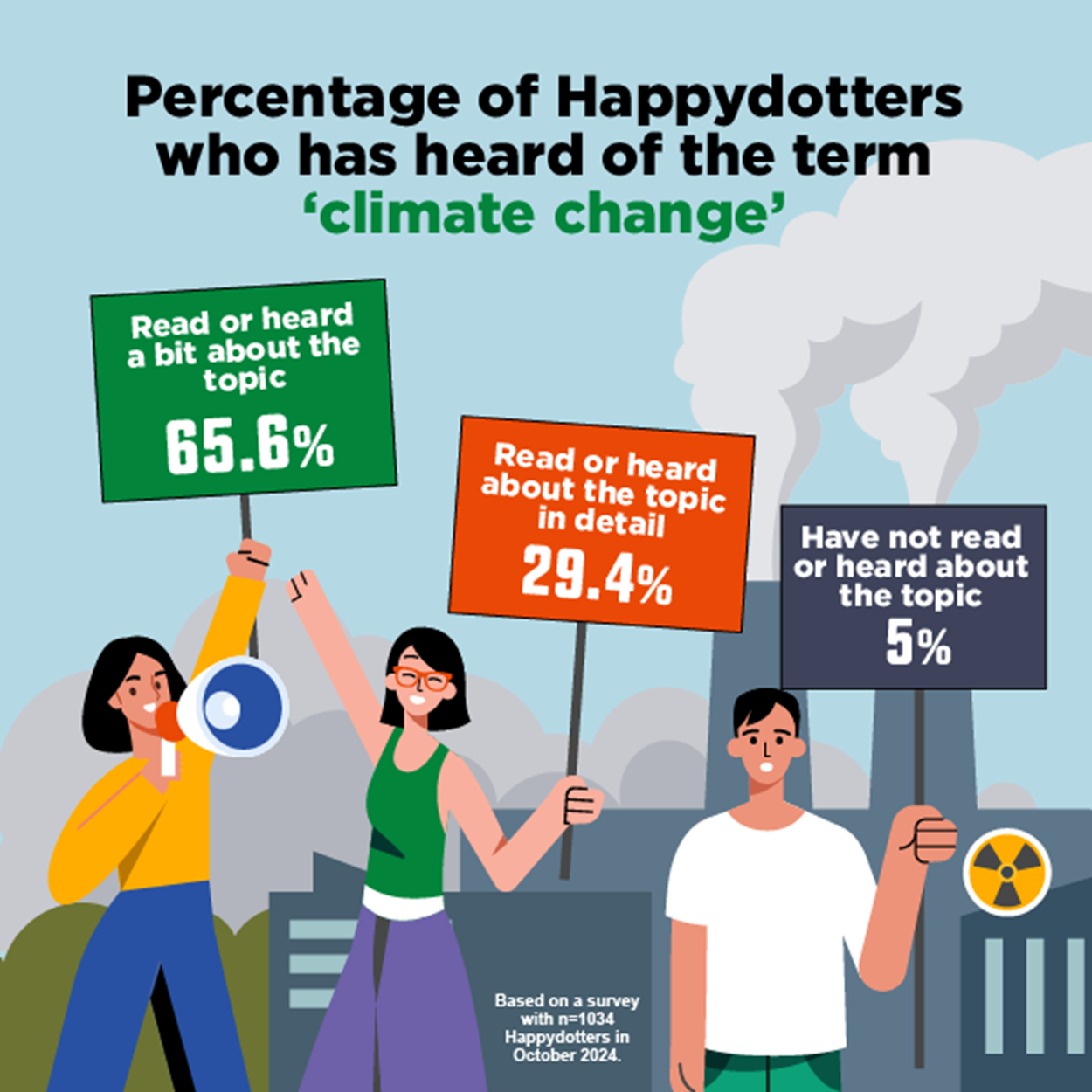 The data shows that climate change awareness in Singapore is near-universal. 95% of Happydotters have read or heard a bit or in detail about the topic “climate change.”