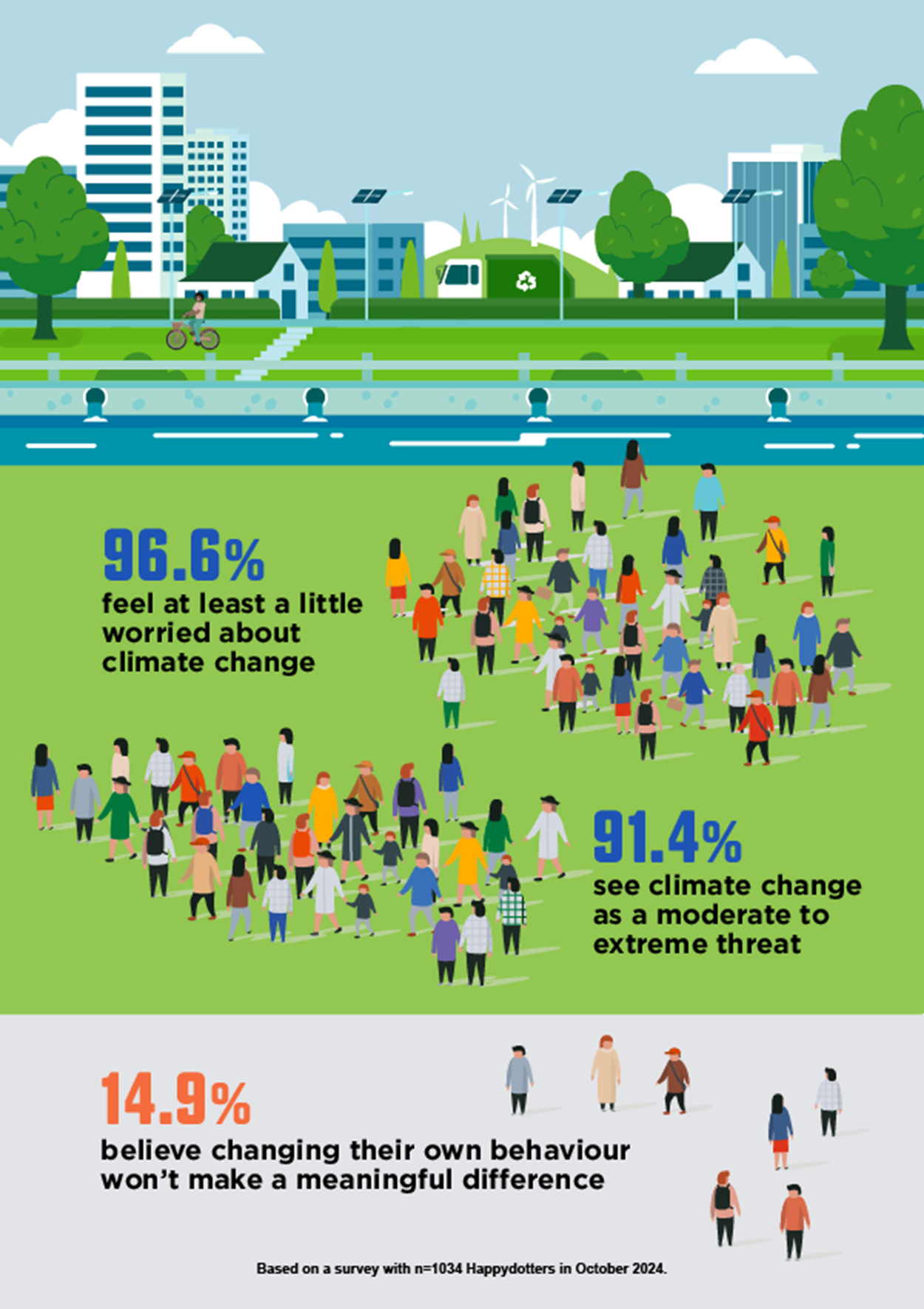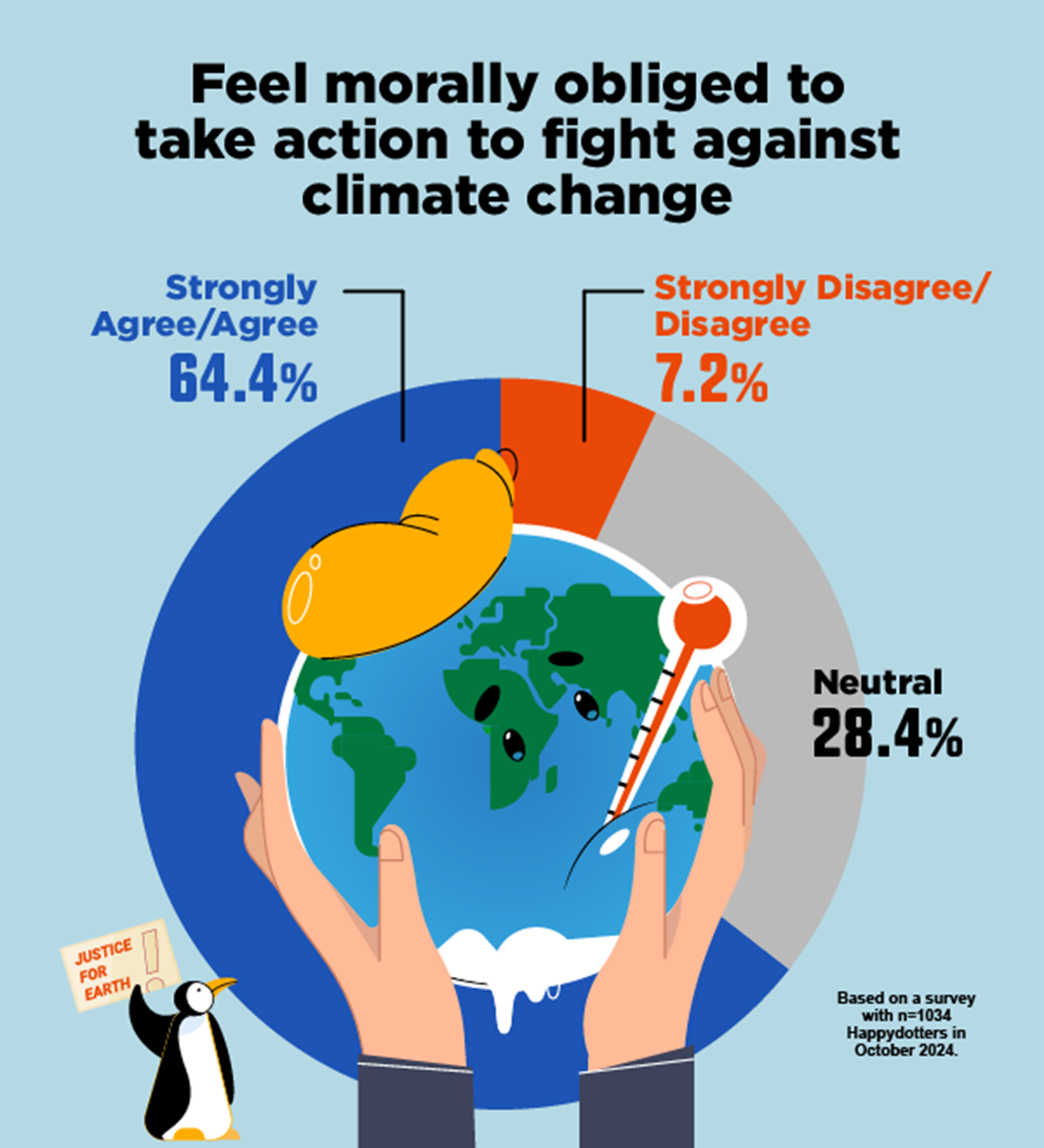 Climate change is no longer a fringe topic in Singapore. Based on an online survey done with HappyDot.sg in October 2024 with 1,034 Happydotters, it shows a clear picture of a population that is highly aware of climate change, broadly concerned about its impact, but still navigating what personal responsibility looks like in practice.