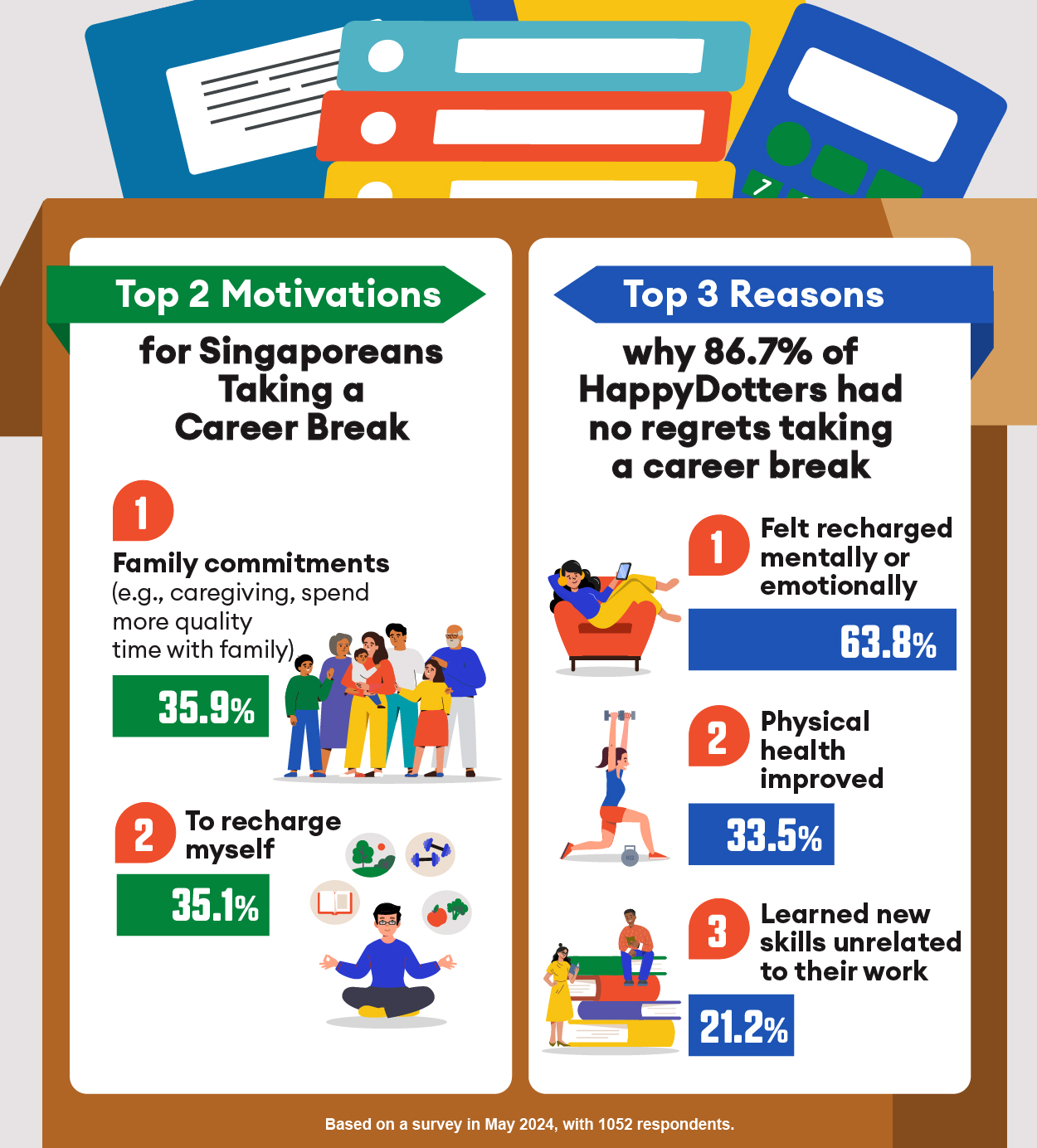 Forget the grind. Around 1 in 3 HappyDotters (35.1%) said their reason for stepping away from work was simple: they needed to rest and recharge An overwhelming 86.7% of HappyDotters said they had no regrets about taking a career break, with the top reason being that it helped them feel mentally or emotionally recharged (63.8%), followed by their physical health improve (33.5%)