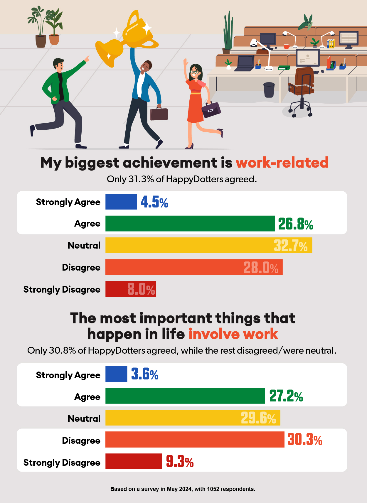 Only 31.3% of HappyDotters said their biggest life achievement was work-related. More are now chasing milestones like personal growth, experiences, and relationships.