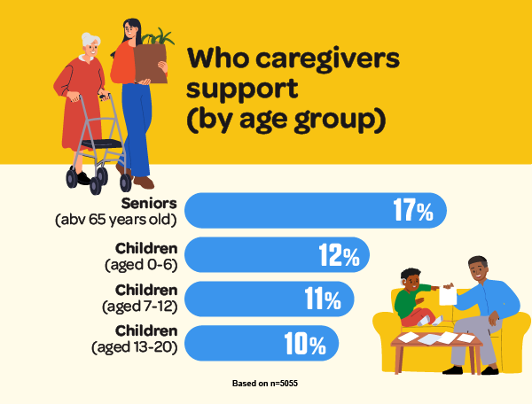 Children represent the next significant caregiving demographic. 12% of respondents care for children aged 0-6, while 10% support children aged 7-12. Caregiving responsibilities are lower with older children with only 10% caring for teenagers aged 13-20 and 8% supporting young adults aged 21-60.