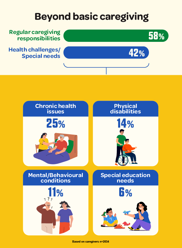 Beyond basic caregiving, the data reveals significant challenges around special needs support. Among those providing primary care, 42% have dependents with health challenges or special needs. It is further observed that 25% have dependents with chronic health issues, making this the most prevalent condition requiring specialized attention; 14% have dependents with physical disabilities; 11% have dependents with mental or behavioural conditions, and 6% have dependents that require special education needs support.