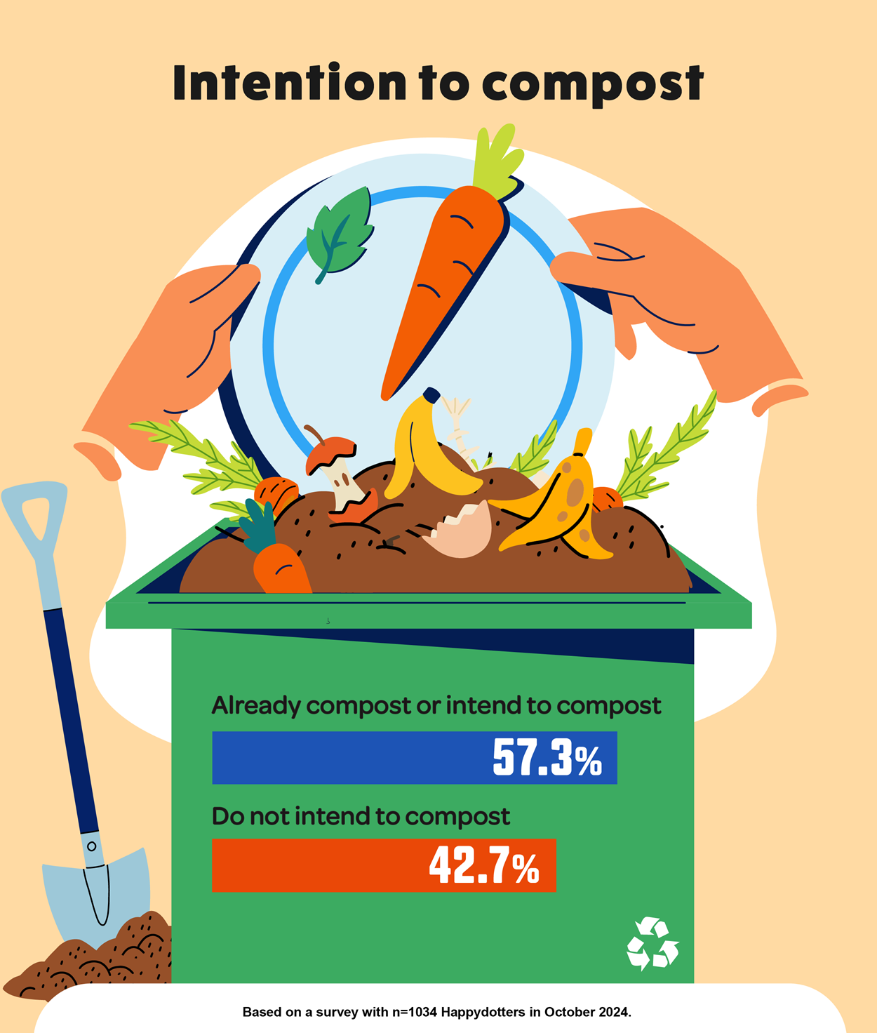 When asked about composting intentions, 57.3% of Happydotters indicate that they either already compost or intend to compost, while 42.7% say they do not intend to compost.