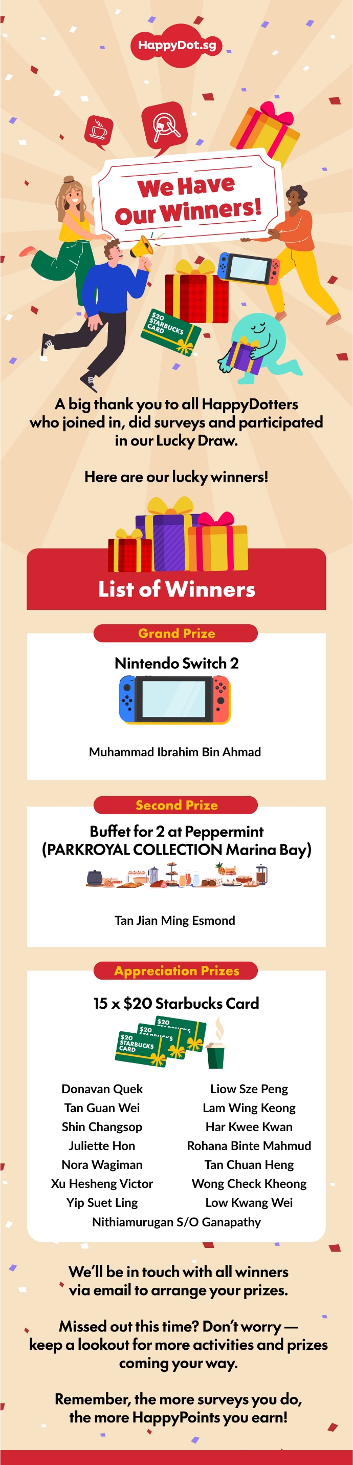 Winners will receive an email from HappyDot.sg after the draw is completed. Winners will be notified by the second week of February 2026.