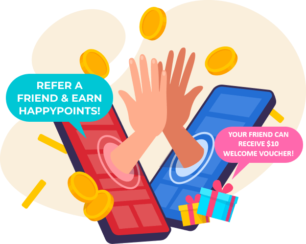 Get rewarded with HappyPoints for referring friends  —  each friend gets a $10 Welcome Voucher too!